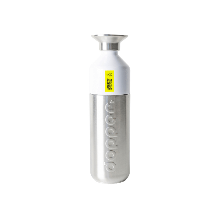 Kies voor de Dopper Steel waterfles met Amnesty logo en maak een verschil in de wereld, terwijl je gehydrateerd blijft op al je avonturen.