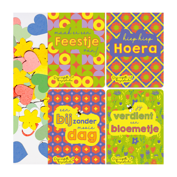 Bestel vandaag nog deze unieke set plantbare confetti ansichtkaarten en verras je dierbaren met een cadeau dat letterlijk blijft geven. Voor slechts €10,00 geef je een kaart die niet alleen een glimlach brengt, maar ook uitgroeit tot een prachtige herinnering in de tuin!